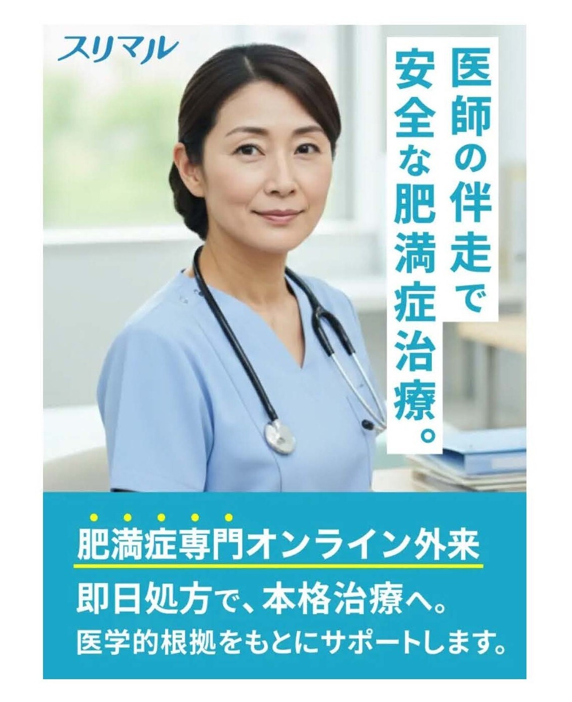 肥満症の専門医と治療対象者をつなぐためのサイトです。ユーザーは保険診療と自由診療を選択でき、保険診療希望者は肥満症の治療が可能な専門の医療機関を一覧で閲覧することができます。また、オンライン診療などの予約ができるよう、各医療機関のホームページに案内します。また、自由診療を希望する患者には「スリマル」のサイトに案内し、治療をサポートします。